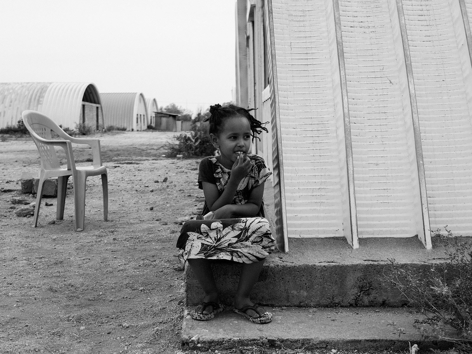 Bambina seduta fuori da casa.