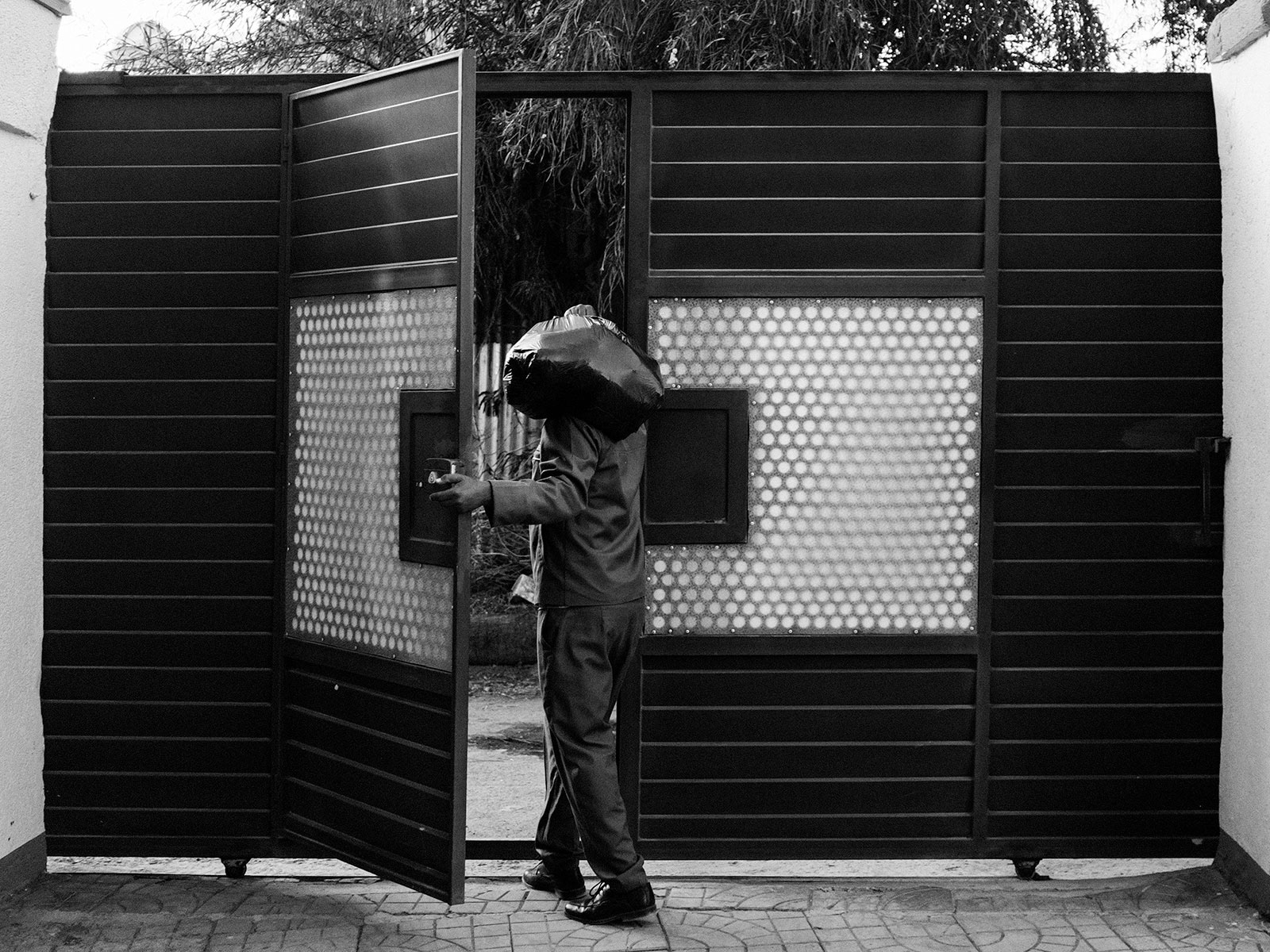 Uomo esce dal cancello.