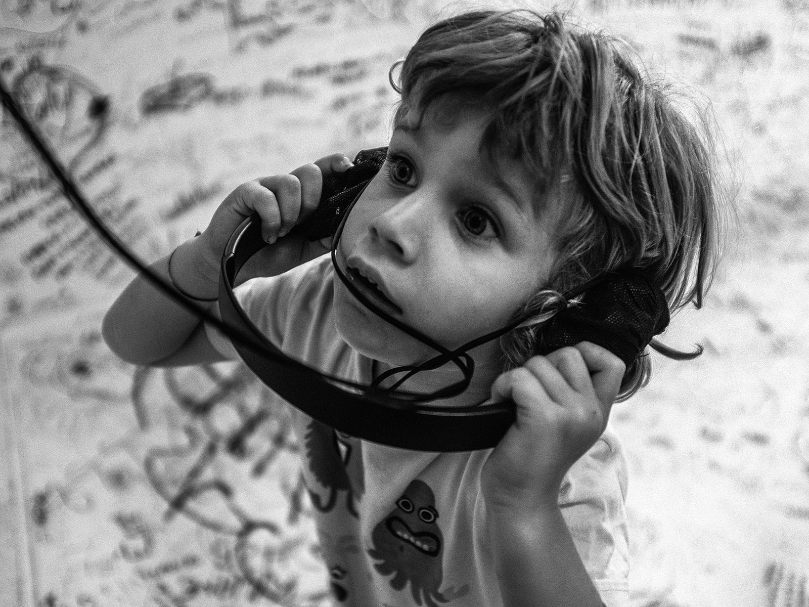 Andrea ascolta con le cuffie al museo.